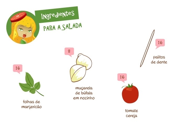 Com a ajuda de um adulto, coloque um nozinho de muçarela de búfala, uma folha de manjericão e um tomate no palito.